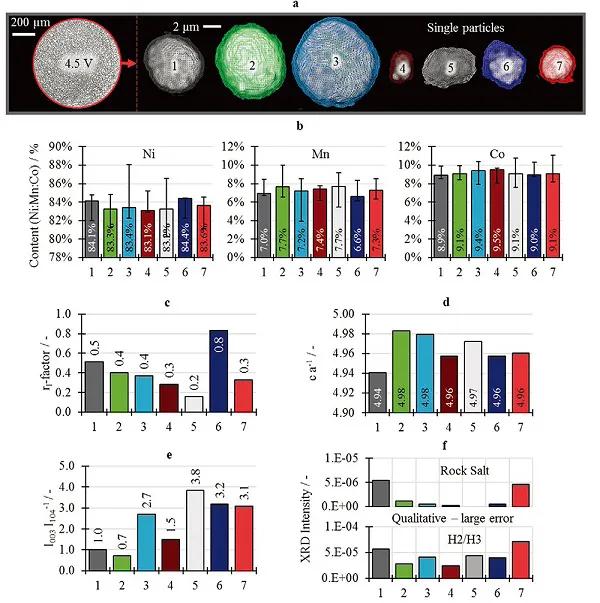 為了進(jìn)一步表征次級(jí)顆粒在高電壓下的形貌及結(jié)構(gòu),作者對(duì)在4.5 V下循環(huán)充放電后極片上的顆粒進(jìn)行了深入分析。這些顆粒的信息源自X射線衍射及熒光檢測(cè),并通過X射線納米斷層掃面技術(shù)進(jìn)行成像。通過該方法繪制了不同顆粒的灰度直方圖(圖3b,c)及顆粒徑向的灰度信息。發(fā)現(xiàn)顆粒1灰度值最高,表明該顆粒包含的缺陷數(shù)量最少,顆粒7灰度值最低,意味著該顆粒可能存在大量缺陷。由圖3d可看出,顆粒灰度值(缺陷數(shù)量)與顆粒尺寸間沒有明顯的關(guān)聯(lián),因此在低倍率(0.5 C)下,顆粒的尺寸大小并不是造成次級(jí)顆粒裂痕的主要因素。