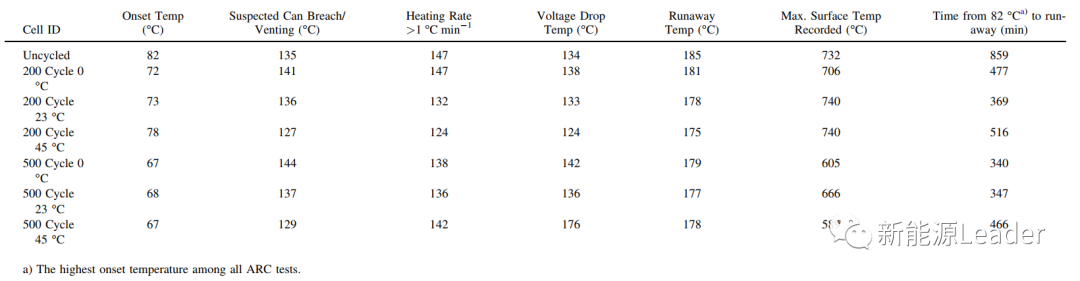 與未循環電池相比,對于循環電池,從82℃(最高起始溫度)到發生熱失控所需的時間更短,表明循環電池的熱穩定性更差,與所有溫度下循環電池的自加熱速率更高一致。