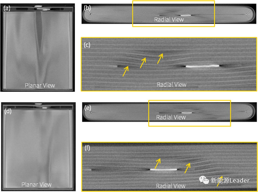 圖1. 兩只代表性的未循環電池的CT二維截面圖。(a)電池1的俯視圖,(b)電池1的徑向視圖,(c)電池1的放大徑向視圖,(d)電池2的俯視圖,(e)電池2的徑向視圖,(f)電池2的放大徑向視圖。