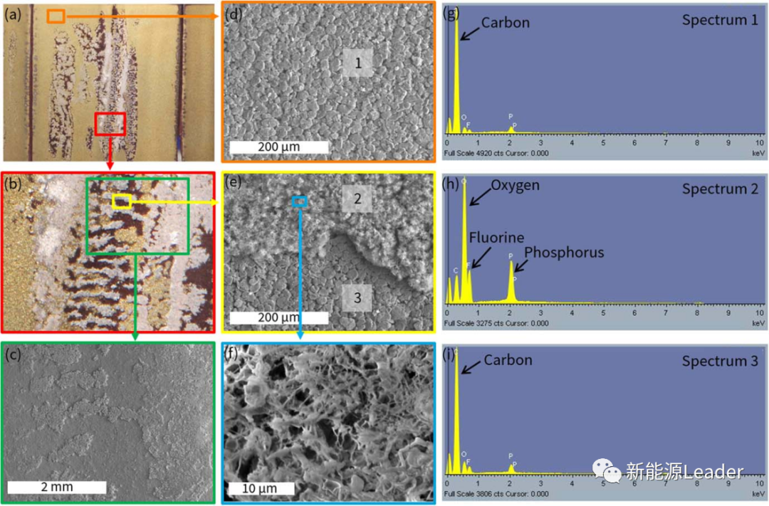 圖8b的放大圖表明45℃下循環500次的負極具有三種不同的區域:金色區域(無沉積物)、紅色和深色區域,有沉積物的銀色/灰色區域。金色區域的SEM和EDS分析表明該區域為典型的石墨(碳)負極形貌,碳峰很強。與金色區域對比,紅色和深色區域沒有明顯的化學或形貌不同,表明該區域為石墨的不完全鋰化,對應電極間隙導致的電極接觸不良。銀色/灰色沉積物具有苔蘚狀形貌,是典型的析鋰特征,部分區域出現枝晶。暴露在空氣中的電極EDS圖譜顯示了主要的氧峰,與局部析鋰對應。