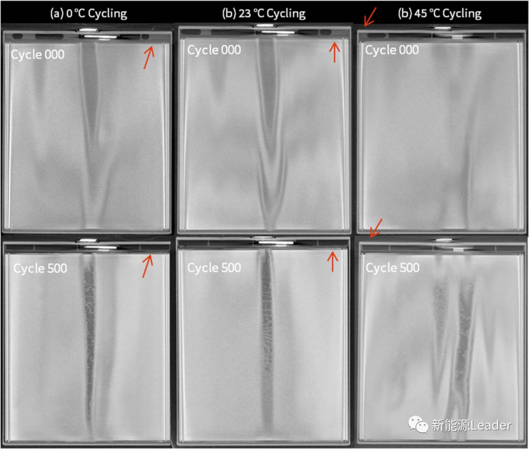 沿著電極間隙區域的二維平面剖面圖表明45℃下循環的電池間隙區域,在經過500次循環后明顯增加。從平面剖面圖可定性地觀察到電解質消耗或重新分布。沒有循環時,電解質出現在電池頂部,為中密度材料(圖6的紅色箭頭)。電解質大部分被多孔電極和隔膜所吸收,少量電解質可在卷芯的頂部和電池殼體處形成彎月面。不考慮溫度影響,循環500次后電池不存在過多的電解質。