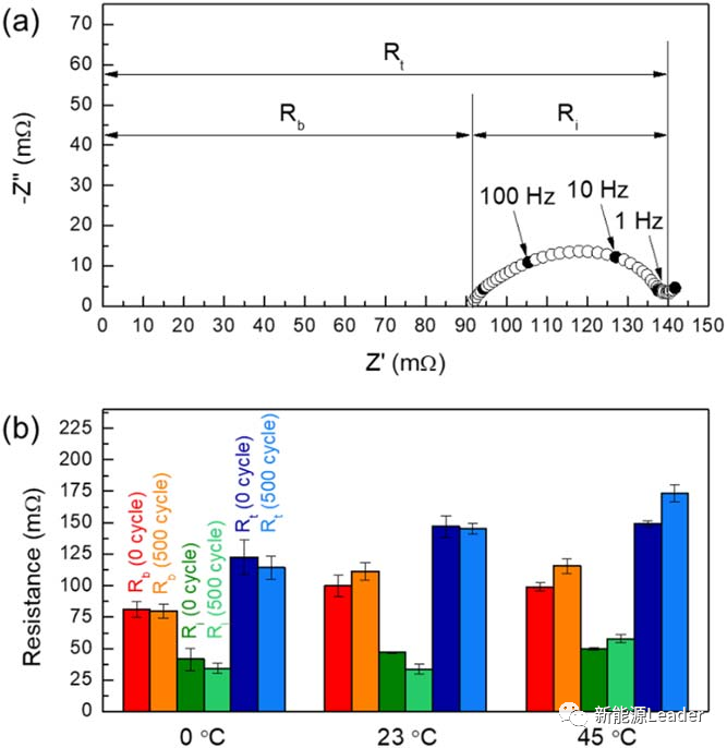 循環500次后滿電電池的EIS表明在高頻區有一個圓弧,在低頻區出現一條直線。Ri代表界面阻抗,包括SEI阻抗和法拉第電荷轉移阻抗。Rb代表電池的本體阻抗,包括電解質、隔膜和電極的歐姆阻抗,以及極耳連接的阻抗。0℃循環500次的電池本體阻抗幾乎沒有變化,可能是歸因于在低溫下慢的電解質降解動力學。23℃和45℃循環500次的電池本體阻抗分別增加11.6%和16.7%,可能歸因于電解質變干和/或電極衰退,兩種情況均會增加歐姆阻抗。此外,在0℃和23℃循環500次的電池,界面阻抗分別降低17.3%和28.6%。而45℃下循環的電池界面阻抗增加了16%,歸因于形成了更厚的SEI層和/或電極材料的表面衰退。一般而言,0℃下循環的電池總阻抗降低,衰退最慢;23℃循環的電池總阻抗幾乎沒有變化,歸因于略微增加的本體阻抗和略微降低的界面阻抗;而45℃循環的電池阻抗增加最多,表明衰退最嚴重。