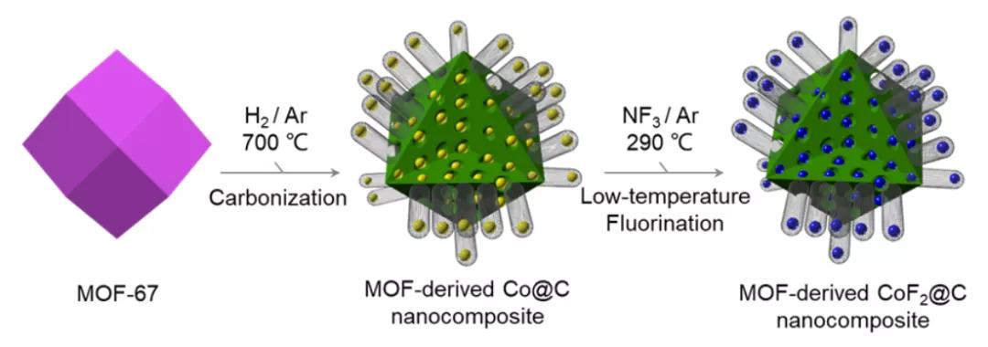 圖1為CoF2@C納米復合材料的合成示意圖。該合成方法主要包括兩個步驟:第一步是將含Co的MOF-67高溫碳化生成MOF形狀的Co@C納米復合材料。在此過程中,Co納米顆粒可以催化碳骨架表面碳納米管的生長。第二步是低溫氣固氟化反應,低溫氟化能夠有效繼承前驅(qū)體Co@C的形貌結(jié)構(gòu),實現(xiàn)MOF形貌結(jié)構(gòu)CoF2@C納米復合材料的可控制備。