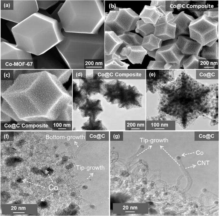 圖2為MOF-67和Co@C復合材料的形貌圖。MOF-67為菱形十二面體,表面光滑,尺寸分布均勻,約600 nm。使用還原性氣體(H2/Ar)進行高溫碳化后,Co@C骨架基本延續(xù)了MOF-67的菱形十二面體形狀和粒度,但表面變得粗糙多孔。Co納米顆粒平均粒徑為5-20 nm,均勻地分布在多孔碳骨架中。此外,Co納米顆粒成功催化了碳骨架表面碳納米管的生長。