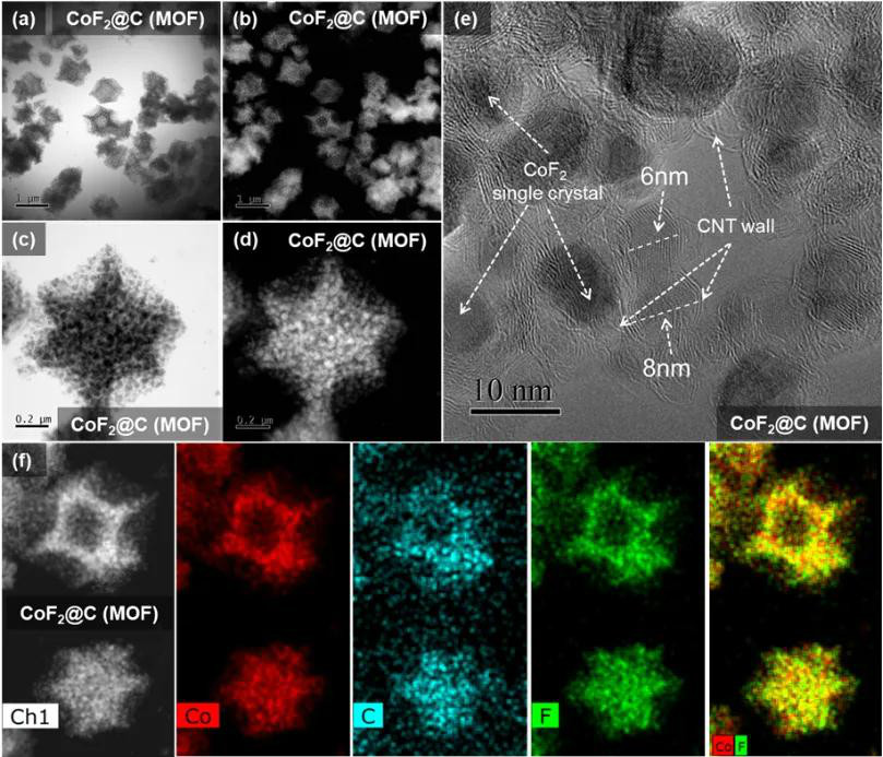 圖3為CoF2@C復合材料的TEM圖。氟化后,MOF形狀的CoF2@C復合材料依然呈現(xiàn)均勻的十二面體形態(tài),平均粒徑略有增大約800nm。CoF2晶粒(5-20 nm)被石墨碳層包覆,并均勻地嵌入多孔碳骨架中。元素面掃表明CoF2@C復合材料中Co,C和F的元素均勻分布,進一步證明了CoF2納米顆粒在碳骨架中的納米約束。