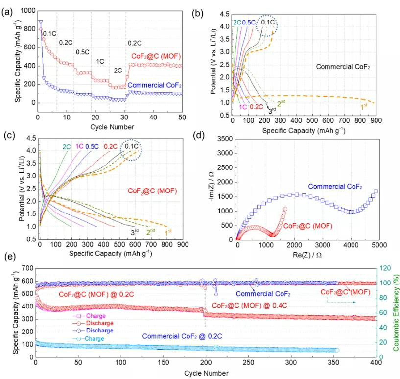 作者利用低溫氣相氟化技術,實現(xiàn)了具有MOF形狀的CoF2@C復合材料的高效制備。這種復合結(jié)構(gòu)有效地實現(xiàn)了納米CoF2(5〜20 nm)在多孔碳骨架中的約束,更為重要的是,三維碳骨架提供了交聯(lián)的介質(zhì)和相互連接的納米孔道為轉(zhuǎn)換反應提供了有效的Li+/e-傳輸通道并縮短了擴散途徑,加快了轉(zhuǎn)換反應動力學。另外,石墨化碳壁作為CoF2上的保護層可以抑制活性物質(zhì)的溶解,骨架中的間隙可以緩解體積膨脹帶來的的不利影響。因此,CoF2@C在1.5mg·cm-2的活性物質(zhì)負載下,展現(xiàn)出較高的比容量(0.1C時為554 mAh·g−1,0.2C下為472 mAh·g−1)和倍率性能(高達2C),以及長期循環(huán)穩(wěn)定性(400次循環(huán)中平均容量保持率為95%)。這種合成方法具有普適性,可實現(xiàn)其他具有特定形貌結(jié)構(gòu)的金屬或金屬化合物的定向氟化。