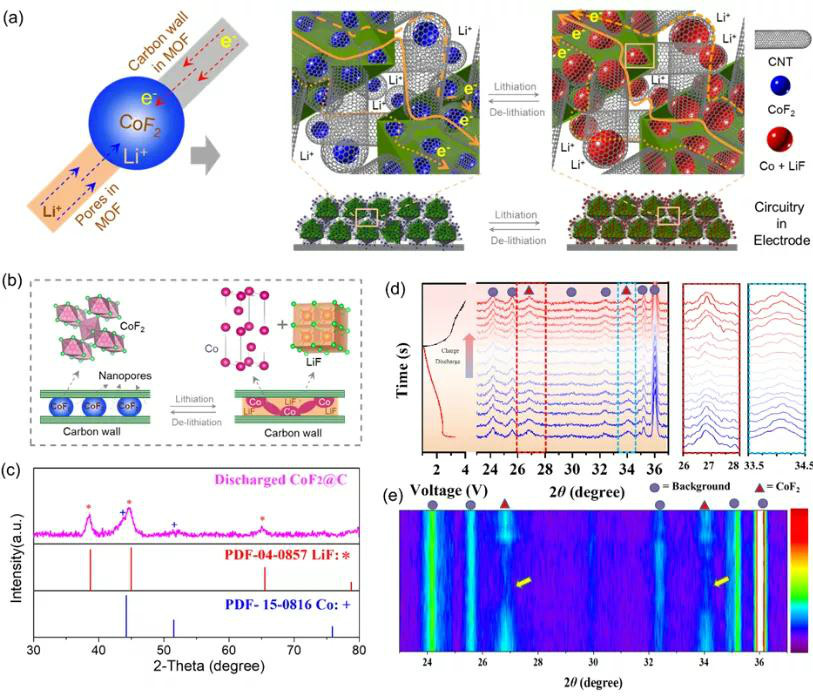 圖5揭示了CoF2@C正極的工作機制。首先,骨架外表面CNT增強了CoF2@C復合粒子間物理接觸,促進了復合顆粒間的電子傳輸。其次,在單個CoF2@C顆粒內(nèi),交聯(lián)的石墨化-無定形碳網(wǎng)絡和相互連接的納米孔道分別為電子和離子傳輸提供了有效的傳輸路徑,最終實現(xiàn)了納米限域內(nèi)CoF2(5∼20 nm)的高效電化學轉(zhuǎn)換型反應。為了揭示CoF2@C正極的電化學行為,在充放電過程中利用非原位和原位XRD證明了循環(huán)中CoF2的可逆轉(zhuǎn)換反應機理。