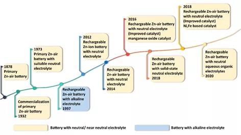Jindra等人在1973年研究了氯化銨水系中性電解液在鋅空氣電池中的應用。但是堿性電解液(如氫氧化鉀,氫氧化鈉和氫氧化鋰水溶液)具有高離子電導率。比如常用的重量比35%的氫氧化鉀溶液在25℃時具有高離子電導率(0.55 S cm-1)和低粘度(2.2339 mPa s)。它能夠制備更高能量密度的電池,因而在目前的商用一次性鋅空氣電池中得到了更廣泛的應用。更為重要的是,氧還原反應(ORR)和析氧反應(OER)中常用的催化劑在堿性電解液中具有更高的催化活性。但堿性電解液的使用也會帶來很多難以解決的問題,從而使中性電解液再次引起了關注。鋅空氣電池的發展歷程如圖1。