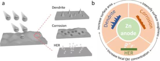 圖3. 鋅負極的挑戰:枝晶生長、腐蝕和析氫副反應。