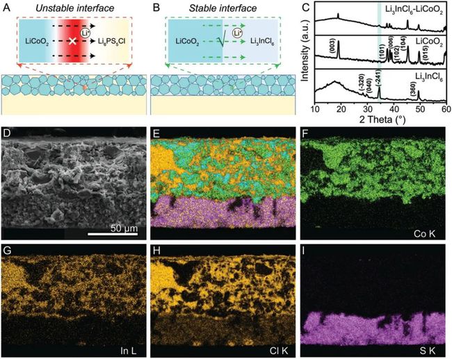 硫化物SEs與LiCoO 2的穩定性較差,容易導致界面鈍化層形成,離子傳導緩慢。為應對這一挑戰,作者采用鹵化物超離子導體Li 3InCl 6作為正極層中的SE,以形成具有快速離子轉移的穩定界面,而無需額外的界面涂層。