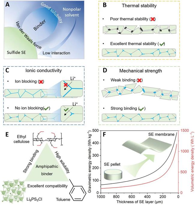 與傳統的冷壓法相比,粘結劑輔助溶液法可以有效地制造出薄SE膜,并且具有可擴展性。但是,粘結劑必須滿足以下要求:1)與陶瓷離子導體和溶劑的化學相容性高;2)在高溫(≈200 °C)處理以去除溶劑期間具有優異的熱穩定性;3)優越的機械結合強度;4)優良的成膜性;5)對離子傳導的不利影響可以忽略不計。
