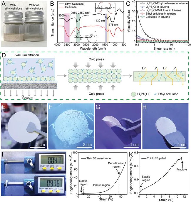 當在甲苯中分散時,Li 6PS 5Cl-乙基纖維素的分散體顯示出比單一組分更高的粘度,表明Li 6PS 5Cl和乙基纖維素之間存在良好的結合。乙基纖維素的表面帶有來自剩余羥基的負電荷,同時,Li6PS5Cl中的磷和鋰離子作為電子受體與乙基纖維素相互作用并產生鍵合。這種鍵合有助于Li 6PS 5Cl在甲苯中的穩定分散,但強度不足以導致Li 6PS 5C降解。此外,這種強結合作用使得SE膜在過濾后能夠從濾紙上剝離。因此,SE薄膜中的離子傳導路徑可以保持連續而不被阻塞。因此,薄SE膜同時實現了較高的離子電導率和相當大的機械強度。