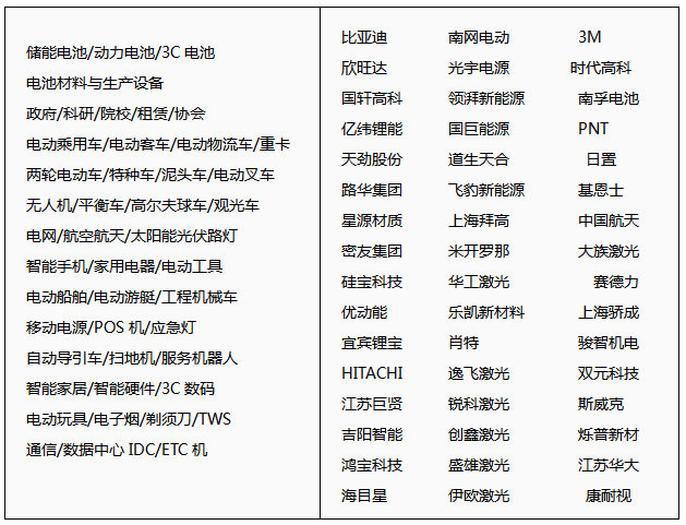 電芯、正極、負極、隔膜、鋁塑膜、鋼殼、電解液、鋰離子電池、鎳氫電池、固態電池、超級電容器、鈉硫電池、鋰一次電池、鋅錳電池、堿錳電池、鋅鎳電池、磷酸鐵鋰電池、三元電池、刀片電池、燃料電池、太陽能電池、薄膜電池、儲能電池、3C電池、方形電池、圓柱電池、軟包電池、密封膠、錳酸鋰、鎳鈷酸鋰、磷酸鐵鋰、錳粉、電解二氧化錳、石墨粉、儲氫合金、攪拌機、涂布機、碾壓機、分切機、烘烤機、卷繞機、點焊機、注液機、檢測儀器、激光焊蓋帽機、干燥機、充放電測試儀器、噴碼機、疊片機、電芯入殼機、化成機、封裝機、電芯配對機、折邊機、點膠機、分容機、手套箱、鋁塑膜成型機、極耳焊接機、分條機、模切機、入殼機、滾槽機、除濕設備、倉儲、搬運機器人、環保設備、凈化設備、干燥室、PACK設備、電芯裝備、其它設備配件、