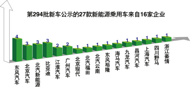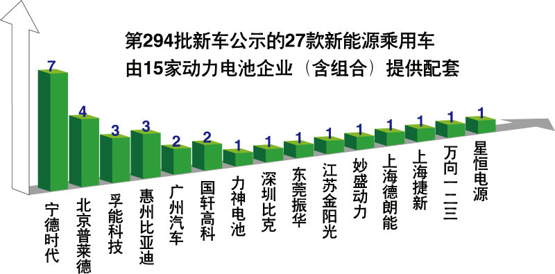 第294批新車公示的27款新能源乘用車由以下15家動力電池企業(含組合)提供配套,分別為:寧德時代、北京普萊德、惠州比亞迪、妙盛動力、孚能科技、廣州汽車、國軒高科、力神電池、深圳比克、東莞振華、江蘇金陽光、上海德朗能、上海捷新、萬向一二三、星恒電源。