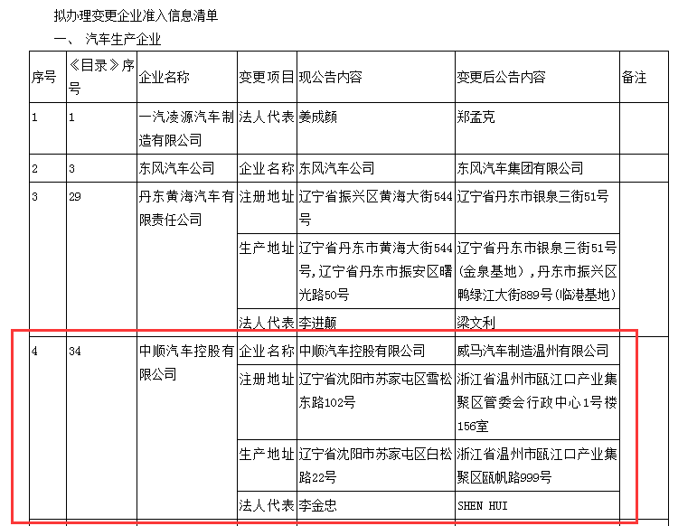 1月16日,工信部公布《道路機動車輛生產企業及產品公告》(第304批)。記者發現在擬辦理變更企業準入信息清單中,中順汽車控股有限公司已變更為威馬汽車制造溫州有限公司,法人代表也由李金忠變更為“SHENHUI”(沈暉)。此外,注冊地址與生產地址也發生了相應的變更。