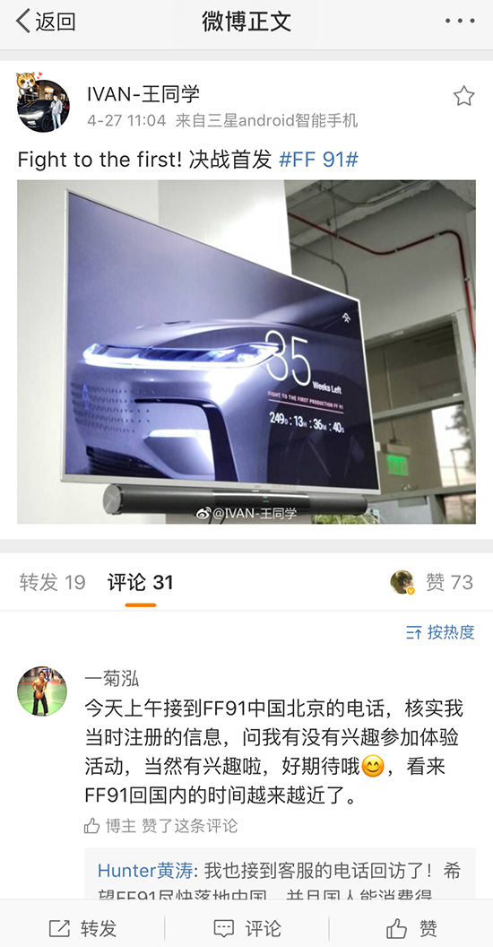 4月27日,有自稱為Faraday Future(美國)數字及社會化營銷總監的微博用戶發出的一張圖片顯示,距離FF91生產還剩下35周。