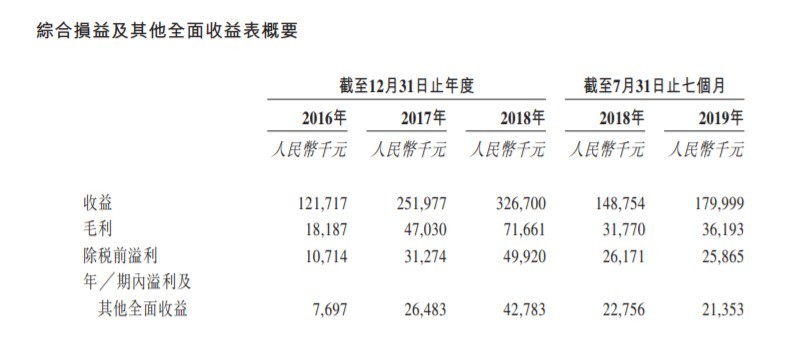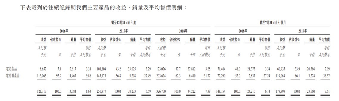招股書(shū)顯示,集團(tuán)的收益由截至2016年12月31日止年度約人民幣1.21億元增至截至2017年12月31日止年度的約人民幣2.52億元,增幅約為107.1%,原因?yàn)楸炯瘓F(tuán)自2016年9月開(kāi)始生產(chǎn)圓柱電芯導(dǎo)致產(chǎn)能大幅提升,并進(jìn)一步增至截至2018年 12月31日止年度的約人民幣3.26億元,增幅約為29.6%。集團(tuán)的收益由截至2018年 7月31日止七個(gè)月的約人民幣1.48億元增至截至2019年7月31日止七個(gè)月的約人民幣1.8億元。截至2016年、2017年及2018年12月31日止叁個(gè)年度以及截至2019年7月 31日止七個(gè)月,集團(tuán)股東應(yīng)占溢利分別為約人民幣770萬(wàn)元、人民幣2650萬(wàn)元、人民幣4280萬(wàn)元及人民幣2135萬(wàn)元。