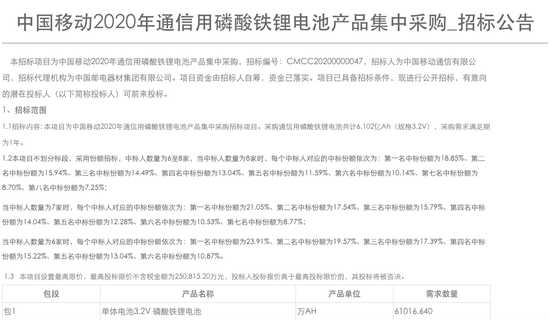 10廠商中標中國移動2020年通信用磷酸鐵鋰電池產(chǎn)品集中采購項目2021-07-15 10:18