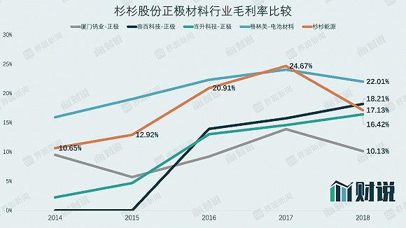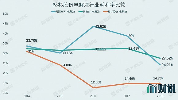 電解液業務毛利率同樣處于行業尾端。杉杉股份電解液業務2014以來毛利率便呈現下滑趨勢,截至2018年底毛利率為14.76%,與行業競爭對手相差平均十個百分點。