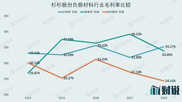 負極材料毛利率則處于行業尾部,產品競爭力越來越弱。2018年,杉杉股份負極業務毛利率為24.41%,相較璞泰來(603659.SH)及貝特瑞的33.9%和35.27%差距較大。值得注意的是,近5年來,杉杉股份與對手的差距已由2014年的相等拉大到如今的十個百分點。