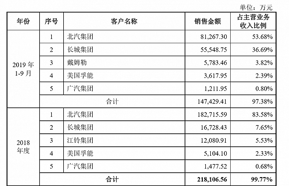 孚能科技最依賴的大客戶即北汽集團。2016年至2019年前三季度北汽集團占公司銷售比重分別為65.63%、87.57%、83.58%及53.68%。北汽集團各個報告期占公司比重皆超過50%,高峰時甚至達到近九成,其關(guān)系密切程度類似“母子”公司。