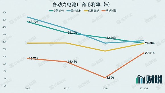 公司2016年至2019年前三季度毛利率,分別為18.73%、16.48%、5.59%和22.51%,對比主要競爭者,就能發(fā)現(xiàn)孚能科技毛利率偏低且變動幅度不合理。