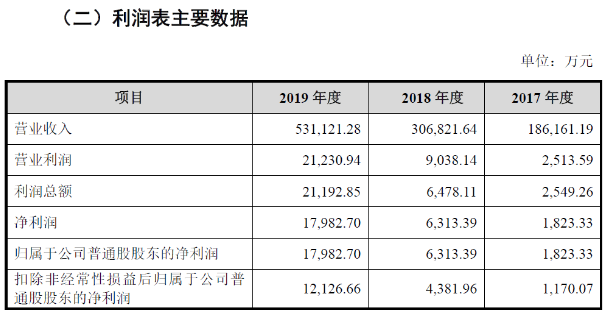 財務數(shù)據(jù)顯示,2017、2018、2019年,中偉股份實現(xiàn)營業(yè)收入18.62億元、30.68億元、53.11億元;實現(xiàn)凈利潤1,823.33萬元、6,313.39萬元、1.80億元。