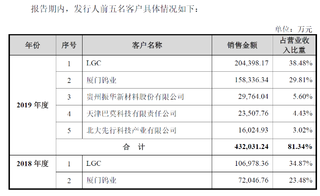 招股書顯示,報告期內(nèi),中偉股份前五大客戶銷售金額占當期營業(yè)收入的比例分別為60.06%、71.41%和81.34%,占比較高且持續(xù)提升,主要是因為公司客戶多為鋰電池正極材料行業(yè)龍頭企業(yè),行業(yè)集中度較高,導致公司客戶相對集中,符合行業(yè)特征。未來,如果公司與主要客戶的合作關系發(fā)生重大不利變化,或者主要客戶的經(jīng)營、財務狀況出現(xiàn)重大不利變化,而公司未能及時培育新的客戶,將對公司生產(chǎn)經(jīng)營和財務狀況產(chǎn)生重大不利影響。