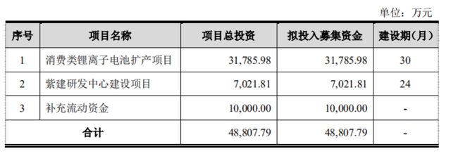 本次募集資金投資的“消費類鋰離子電池擴產項目”是對紫建電子硬殼扣式電池、軟包扣式電池、方形電池等產品的擴產,計劃投資31,785.98萬元進行“消費類鋰離子電池擴產項目”項目建設。