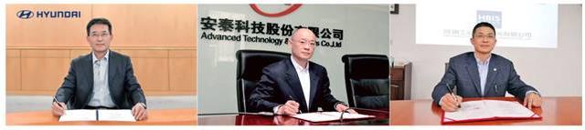 (照片從左開始)11月4日,韓國現(xiàn)代自動車株式會社副社長、商用事業(yè)本部長李仁哲,安泰科技股份有限公司董事長李軍風(fēng),河鋼工業(yè)技術(shù)服務(wù)有限公司執(zhí)行董事單立東,進行“線上”簽約儀式。