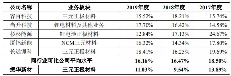 值得注意的是,振華新材的2017年—2019年的三元正極材料毛利率均低于同行業可比公司平均水平。振華新材對此表示,主要原因是由于產業鏈布局的差異所致。