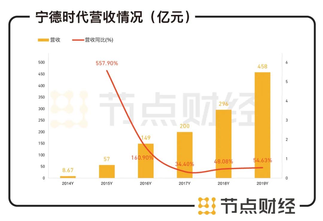 2018年6月,寧德時代成功登陸創業板,市值很快超過中國最大車企上汽集團。到2019年,寧德時代營收同比增長54.63%至458億元,市場份額在當年三季度創下63.58%新高,成了行業“寡頭”。