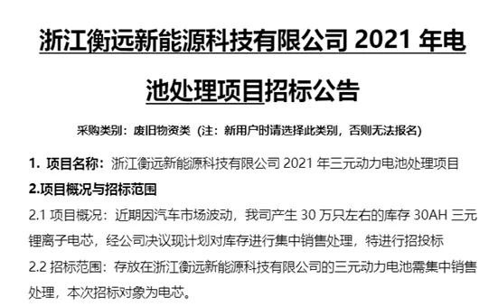 近日吉利旗下電池公司衡遠新能源就其生產的30萬只左右的30Ah三元鋰離子電芯進行公開銷售招標。