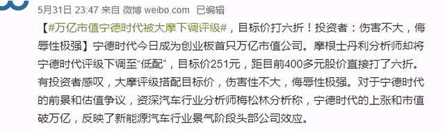 這時候,摩根士丹利就面臨 " 打臉 " 的尷尬了:5 月 31 日,其將寧德時代評級下調(diào)至 " 低配 ",目標價為 251 元。當時有網(wǎng)友稱 " 傷害性不大,侮辱性極強 "。