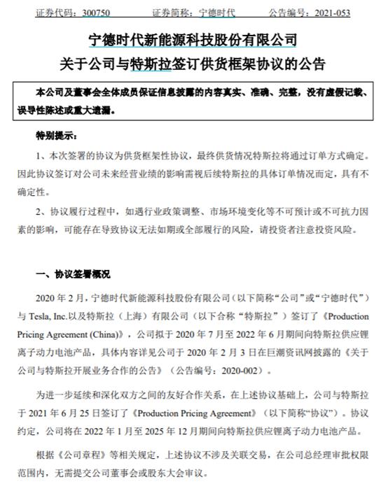 公告稱,協(xié)議的簽訂表示特斯拉對寧德時代動力電池的產(chǎn)品質(zhì)量和生產(chǎn)能力進一步認可,有助于強化公司與特斯拉長期穩(wěn)定的合作關(guān)系,符合公司和股東的利益。根據(jù)《公司章程》等相關(guān)規(guī)定,上述協(xié)議不涉及關(guān)聯(lián)交易,在公司總經(jīng)理審批權(quán)限范圍內(nèi),無需提交公司董事會或股東大會審議。