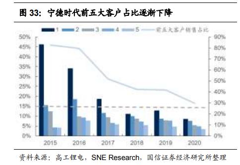 寧德時代作為國內(nèi)配套車型最多的動力電池廠商,2020 年工信部公布的新能源車型目錄共 6800 余款,其中 3400 余款由公司配套動力電池。其下游車企供貨 CR5 從 2015 年 82.6% 降至 2020 年的 29.7%,2020 年單客戶占比甚至低于 10%,很明顯寧德時代在逐步減少對單一客戶的需求依賴,也成就了電池一哥在產(chǎn)業(yè)鏈上的地位。