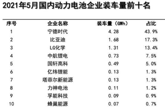 但排名高居榜首的寧德時代的 1-5 月的市場占有率卻跌破 50% 大關(guān)(49.1%)。而且下跌趨勢還愈演愈烈, 5 月份最新的市場占有率將至 43.9%(環(huán)比下降 1.6 個百分點)。