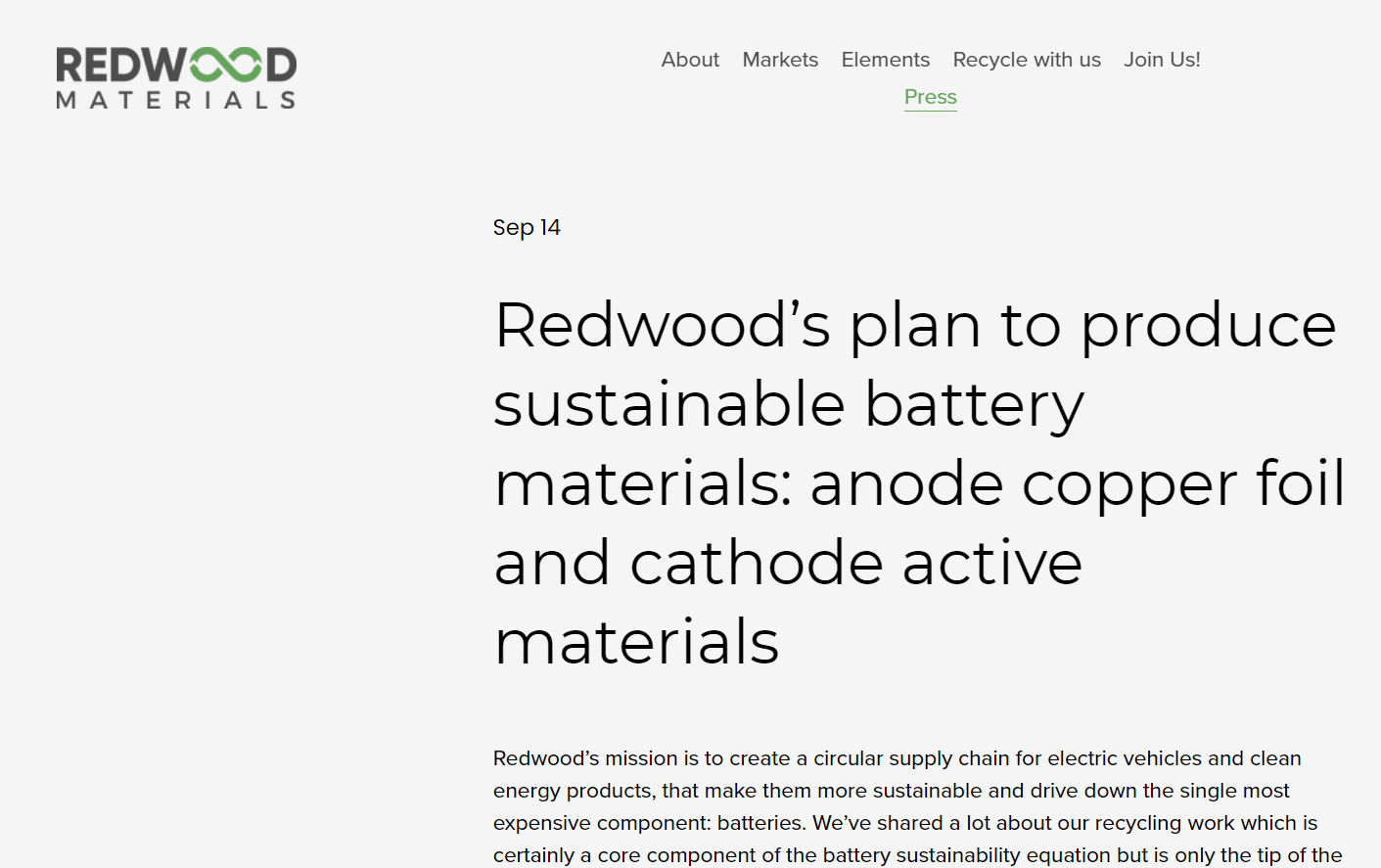 Redwood Materials將在美國建大型電池陰極工廠2024-01-30 09:26
