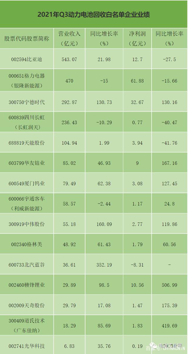 截至10月30日,大部分動力電池回收白名單企業陸續公布了2021年Q3財報。我們整理了其中15家企業Q3業績情況。從中不難看出,大部分企業營業收入同比去年有所增長,甚至獲得了較高的增幅。15家企業中只有3家出現業績下滑的情況,但下降幅度均未超過20%。