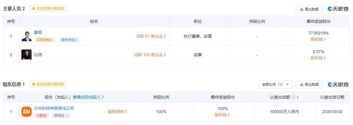 股東信息顯示,該公司由小米科技有限責任公司全資持股。雷軍擔任執行董事、經理。