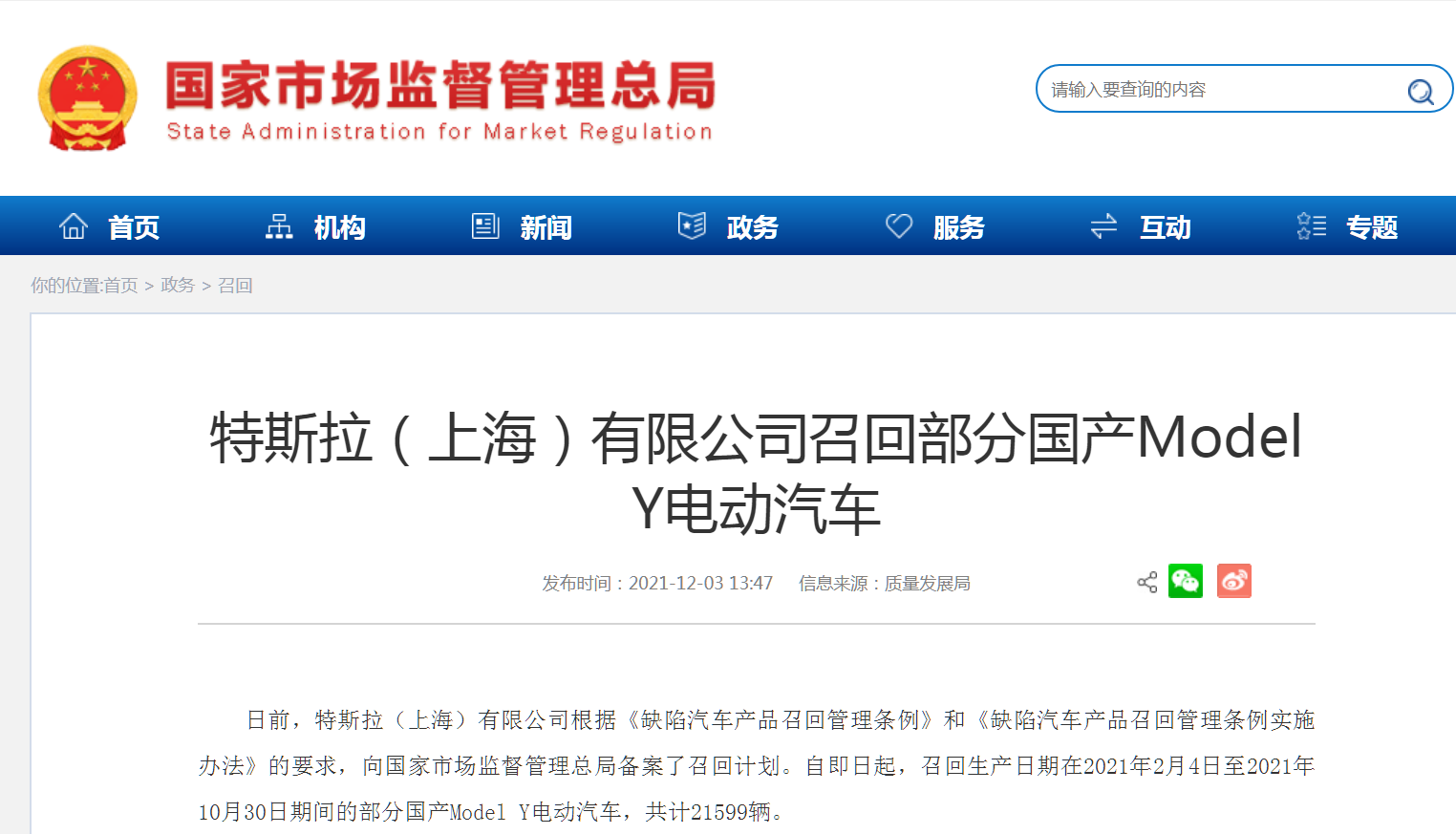 12月3日,特斯拉(上海)有限公司向國家市場監督管理總局備案了召回計劃。自即日起,召回生產日期在2021年2月4日至2021年10月30日期間的部分國產Model Y電動汽車,共計21599輛。