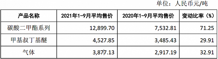 該公司去年10月底披露2021年前三季度主要經營數據公告顯示,旗下三大產品均明顯漲價。具體看來,2021年1-9月,石大勝華旗下碳酸二甲酯系列產品平均售價12,899.7元/噸,較上年同期的7532.81元/噸增長71.25%;旗下甲基叔丁基醚產品平均售價4527.85元/噸,較2020年同期平均售價3485.43元/噸增長29.91%;此外,旗下氣體類產品平均售價是3877.13元/噸,較上年同期的2917.19元/噸同比增長32.91%。