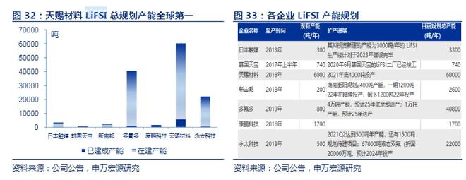 (2)2022 年公司通過技改將6F產(chǎn)能提升到6萬噸,2023年有望再投產(chǎn)5萬噸,此外公司加速雙氟磺酰亞胺鋰產(chǎn)能布局,現(xiàn)有6000噸產(chǎn)能Q2滿產(chǎn)滿銷,預(yù)計22年中新增1萬噸產(chǎn)能。公司雙氟磺酰亞胺鋰(LiFSI)現(xiàn)在產(chǎn)能和規(guī)劃產(chǎn)能均為全球第一,此外,公司還有VC、二氟磷酸鋰、DTD等新型添加劑產(chǎn)能將于22-23年逐步釋放,強化公司一體化競爭力,增厚利潤,可有效對沖六氟價格周期下行。