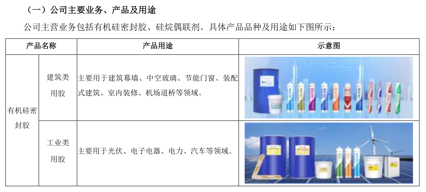 硅寶科技主要從事有機硅密封膠等新材料的研發、生產及銷售,所屬行業為有機硅行業,主要產品包括有機硅密封膠、硅烷偶聯劑。有機硅密封膠又分為建筑類用膠和工業類用膠,建筑行業目前仍是有機硅密封膠最大的應用領域。建筑類用膠主要用于建筑幕墻、中空玻璃、節能門窗、裝配式建筑、室內裝修、機場道橋等領域。在2021年,硅寶科技建筑類用膠產品實現銷售收入17.71億元,同比增長63.04%。工業類用膠主要用于光伏、電子電器、電力、汽車等領域。硅寶科技在2021年工業類用膠實現銷售收入5.02億元,同樣大幅增長了66.47%。硅烷偶聯劑則主要應用于密封膠、光伏EVA膜、人造石英石、玻璃纖維、鑄造樹脂、涂料油墨、改性塑料、改性粉體、金屬表面處理劑等領域。在該領域,硅寶科技在報告期內實現2.69億元的收入,同比增長116.76%。