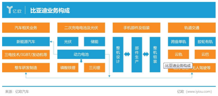 電池開始,到2002年加入手機代工廠行業(yè),2003年下場造車,2010年進軍光伏領(lǐng)域,直至2016年云軌業(yè)務(wù)上線,比亞迪核心業(yè)務(wù)板塊已經(jīng)構(gòu)建完成。