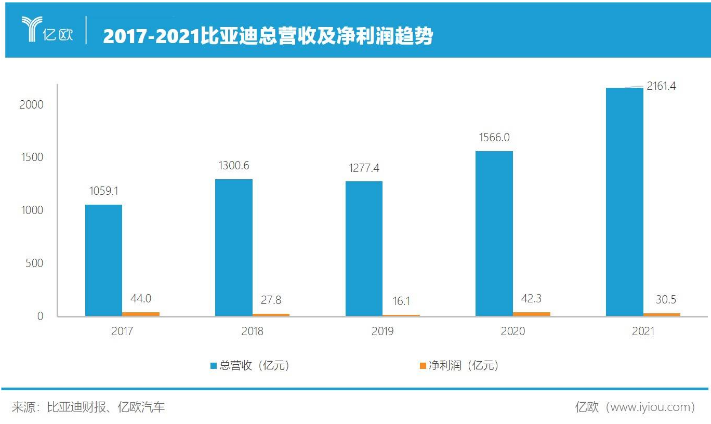 2021年,比亞迪在總營收大增的情況下,凈利潤同比下滑28.08%,為30.5億元。