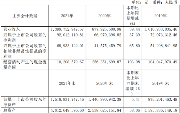 4月18日,深圳市聯贏激光股份有限公司(以下簡稱“聯贏激光”)發布2021年年報。報告顯示,2021年聯贏激光實現營業收入14.00億元,同比增長59.44%,歸屬于上市公司股東的凈利潤為9201.21萬元,同比增長37.39%,每股收益為0.3100元。