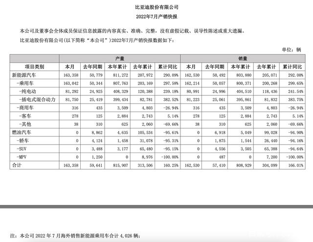 8月3日,比亞迪披露7月產銷快報。其7月銷量達162530輛,同比增長183.1%,其中共銷售新能源乘用車162214輛,同比增長184.7%。本年累計銷量803880萬輛,同比增長292%。