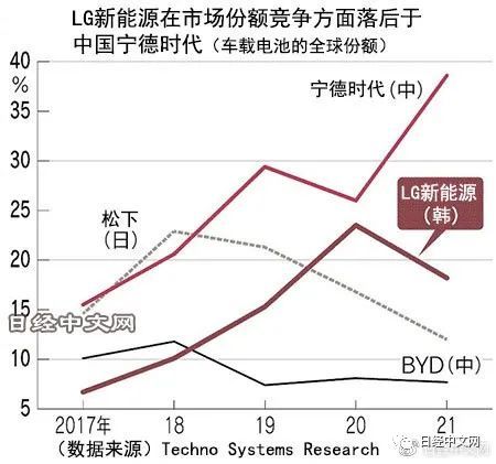 日本調(diào)查公司Techno Systems Research的數(shù)據(jù)顯示,2021年LG新能源的份額為18.2%,比上年下降5.3個百分點(diǎn)。另一方面,寧德時代則增加12.7個百分點(diǎn),猛增至38.6%。進(jìn)入2022年后,LG新能源仍持續(xù)停滯,1~6月的營業(yè)收入僅比上年同期增長0.3%。