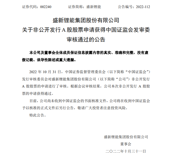 近日,盛新鋰能(002240.SZ)發(fā)布公告稱,10月31日,中國證監(jiān)會(huì)發(fā)行審核委員會(huì)對(duì)公司非公開發(fā)行A股股票的申請(qǐng)進(jìn)行了審核。根據(jù)會(huì)議審核結(jié)果,公司本次非公開發(fā)行A股股票的申請(qǐng)獲得通過。